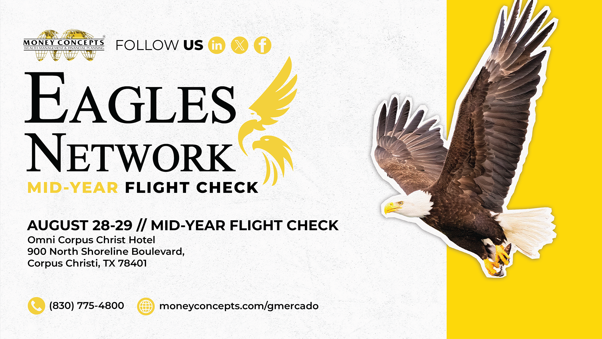 We are thrilled to announce the Eagles Mid-Year Flight Check, which is scheduled to take place in Corpus, TX from August 28-29, 2026. By attending, you will not only expand your understanding of Money Concepts but also have the chance to connect with industry experts and like-minded individuals. Don't miss out on this exceptional occasion – register today to stay informed by filling out the form to receive the latest news and updates.