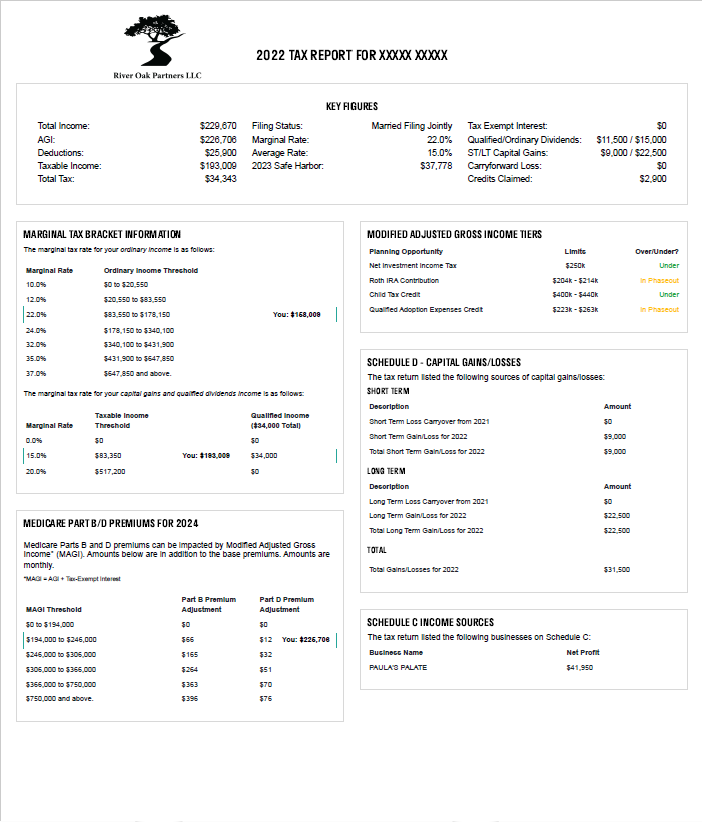Your Tax Report will outline your tax situation, along with observations. These insights will allow you to pursue opportunities going forward to minimize tax obligations and maximize growth potential. We've always preached diversification for investment portfolios but we'd also like diversify your tax portfolio to maximize retirement income.